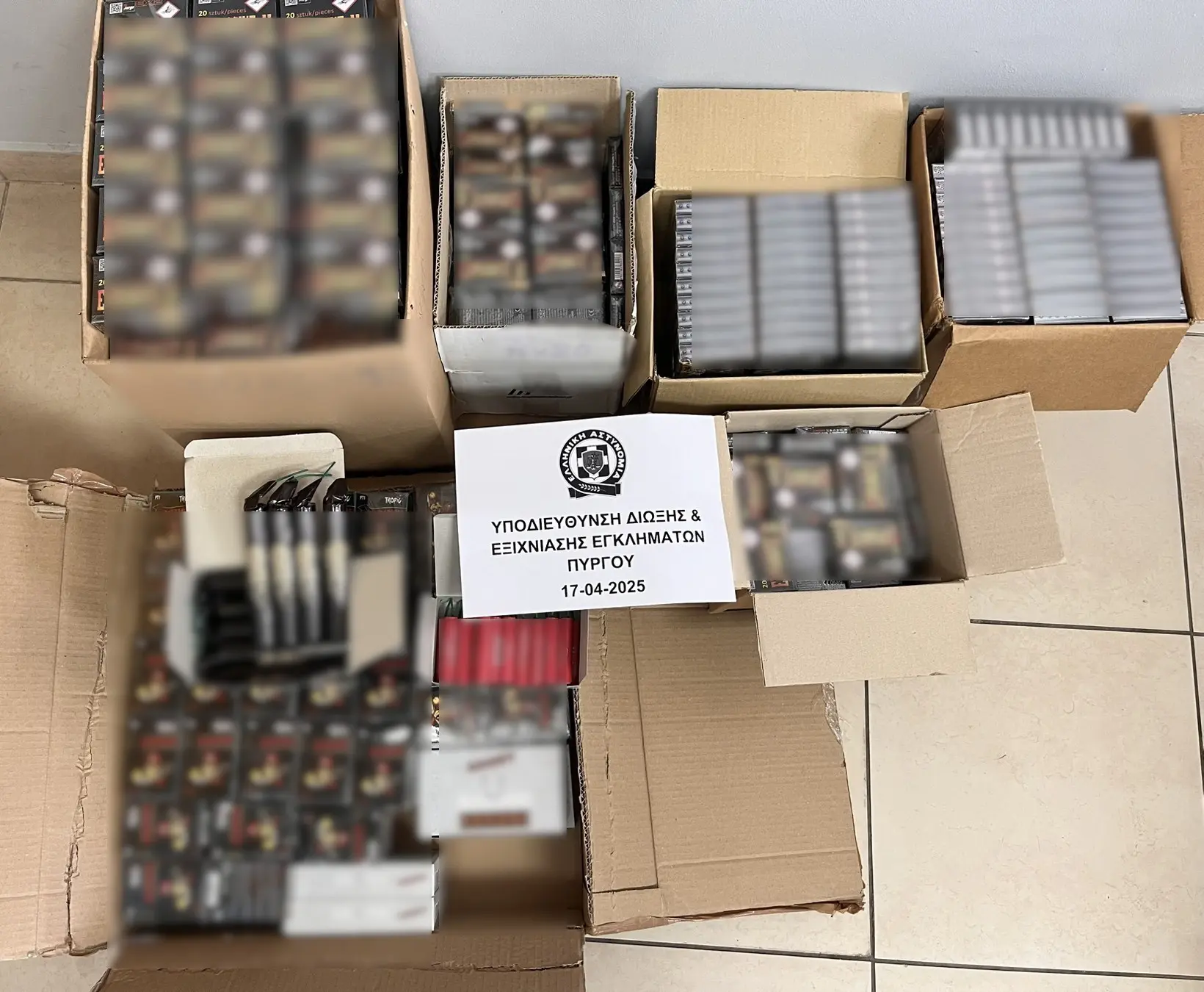 Ειδικότερα, σύμφωνα με την Αστυνομία, στο πλαίσιο ερευνών εντοπίστηκαν σε κατάστημα στον Πύργο εκατοντάδες κουτιά, που περιείχαν συνολικά 25.115 κροτίδες, ενώ σε έρευνα που έγινε σε δεύτερο κατάστημα στον Πύργο, εντοπίστηκαν 360 κροτίδες.