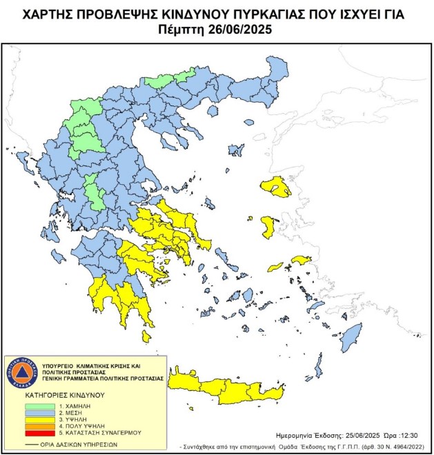 Υψηλός ο κίνδυνος εκδήλωσης πυρκαγιάς (κατηγορία 3) για την Πέμπτη (26/06) στην Περιφέρειας Αττικής, σύμφωνα με τον Χάρτη Πρόβλεψης Κινδύνου Πυρκαγιάς που εξέδωσε η Γενική Γραμματεία Πολιτικής Προστασίας.