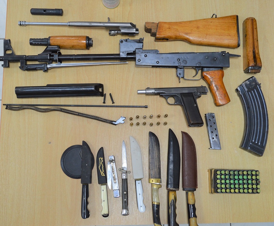 Ακολούθησε έρευνα στην οικία του όπου βρέθηκαν και κατασχέθηκαν πιστόλι με γεμιστήρα, 61 φυσίγγια, εξαρτήματα πολεμικού όπλου και 8 μαχαίρια.
