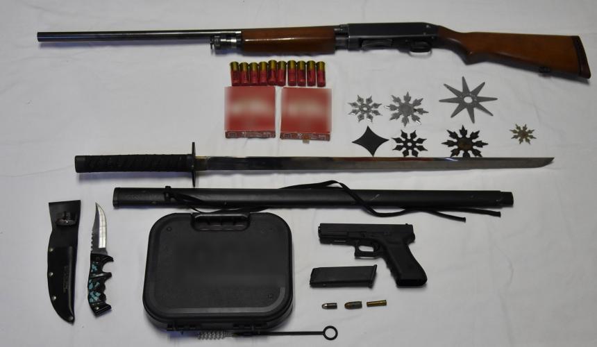 Οι αστυνομικές αρχές κατάσχεσαν: πιστόλι με το γεμιστήρα του, κυνηγετικό όπλο, φυσίγγια διαφόρων τύπων και διαμετρημάτων, σπαθί, μαχαίρι και επτά μεταλλικά αστέρια τύπου "shuriken".