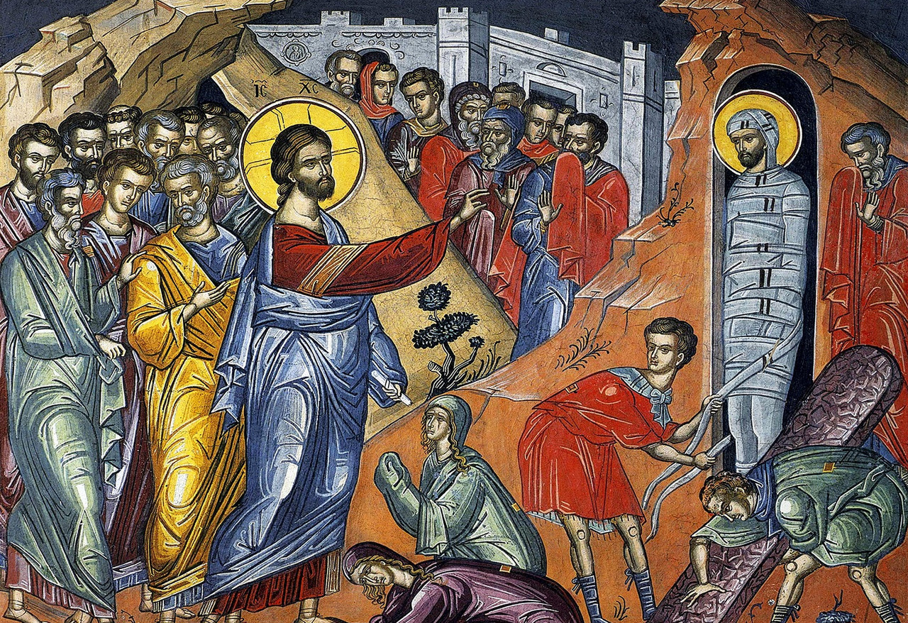 Κατά την Καινή Διαθήκη (Ιωάννου ια’ 1-44), μια μέρα ο Λάζαρος αρρώστησε βαριά και πέθανε. Οι αδελφές του ειδοποίησαν τον Ιησού ότι ο φίλος του ασθενεί βαρέως, αλλά εκείνος καθυστέρησε να έλθει. Στους μαθητές του είπε ότι ο φίλος του κοιμήθηκε και ότι θα μεταβεί στη Βηθανία για να τον ξυπνήσει. Όταν έφθασε στη Βηθανία με τους μαθητές του, η Μαρία του παραπονέθηκε ότι αν ερχόταν εγκαίρως δεν θα πέθαινε ο αδελφός της. Τότε, ο Ιησούς δάκρυσε και με φωνή μεγάλη προ του τάφου εκραύγασε: «Λάζαρε δεύρο έξω!» και ανάστησε τον Λάζαρο τέσσερεις ημέρες μετά τον θάνατό του, προκαλώντας τον θαυμασμό των παρισταμένων και το θανάσιμο μίσος των εχθρών του Φαρισαίων (Ιωάννου ια’ 45-57).