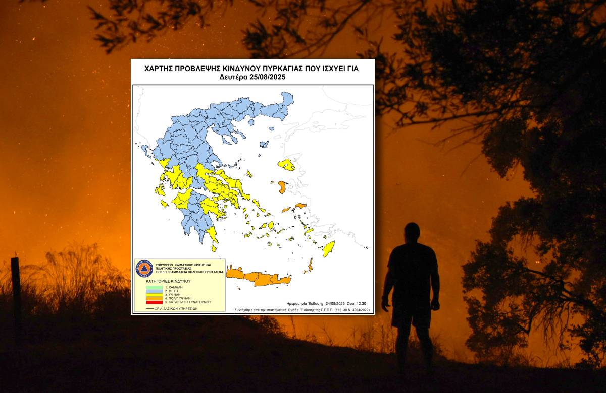 Σύμφωνα με το Χάρτη Πρόβλεψης Κινδύνου Πυρκαγιάς που εκδίδει η Γενική Γραμματεία Πολιτικής Προστασίας του Υπουργείου Κλιματικής Κρίσης & Πολιτικής Προστασίας (civilprotection.gov.gr), για τη Δευτέρα 25 Αυγούστου 2025, προβλέπεται πολύ υψηλός κίνδυνος πυρκαγιάς (κατηγορία κινδύνου 4) για τις εξής περιοχές: