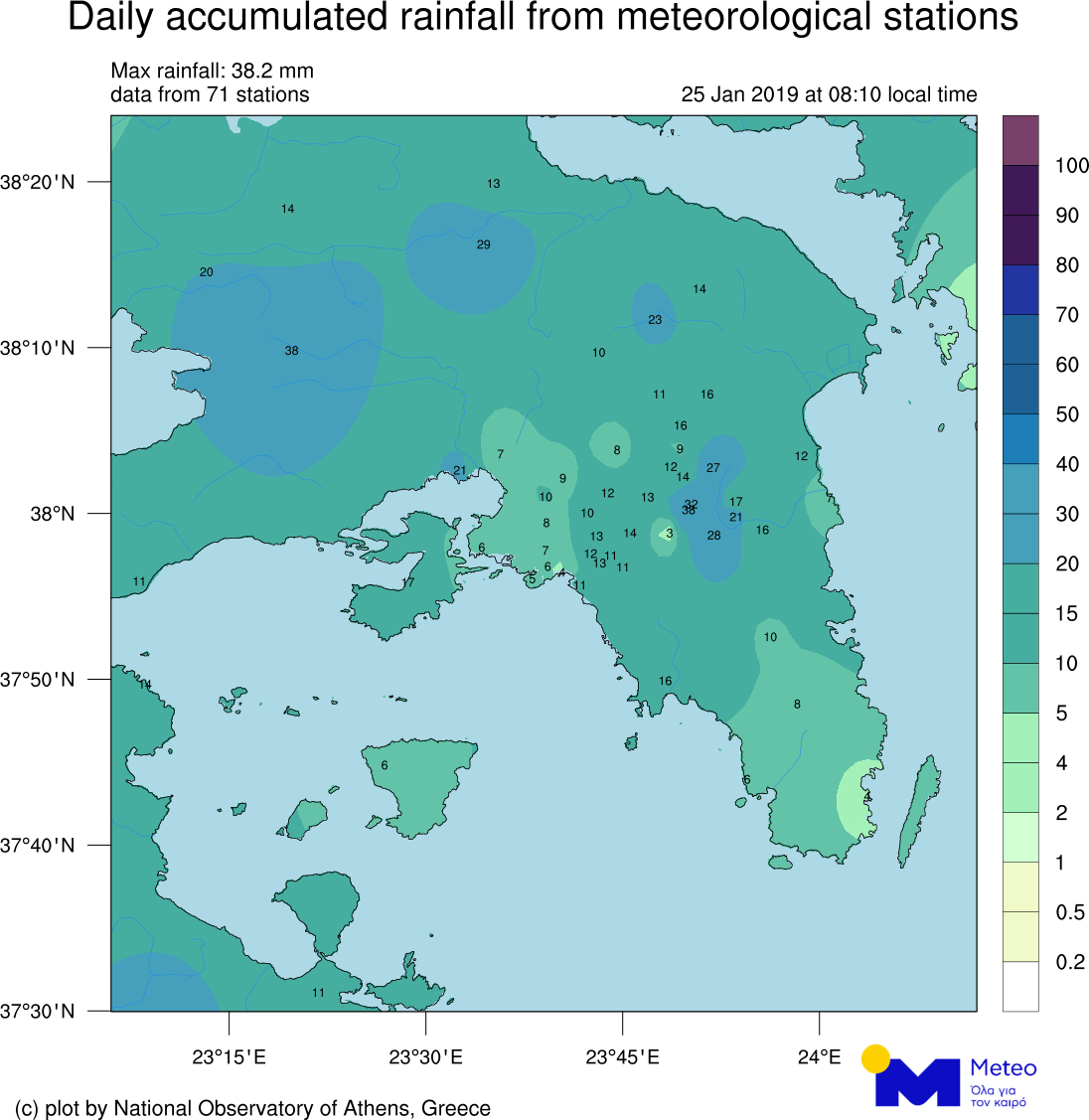 Χάρτης 2. Η κατανομή υετού στην Αττική έως το πρωί της Παρασκευής 25/01
