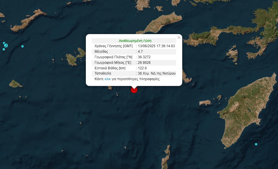 Σεισμός 4,7 βαθμών της κλίμακας Ρίχτερ σημειώθηκε πριν από λίγο ανοιχτά της Νισύρου.