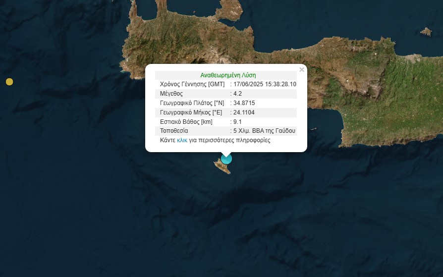 Σεισμός της τάξης των 4,2 Ρίχτερ σημειώθηκε πριν από λίγο ανοιχτά της Κρήτης. ο επίκεντρο του σεισμού εντοπίζεται 19 χλμ βόρεια- βορειοανατολικά της Γαύδου.
