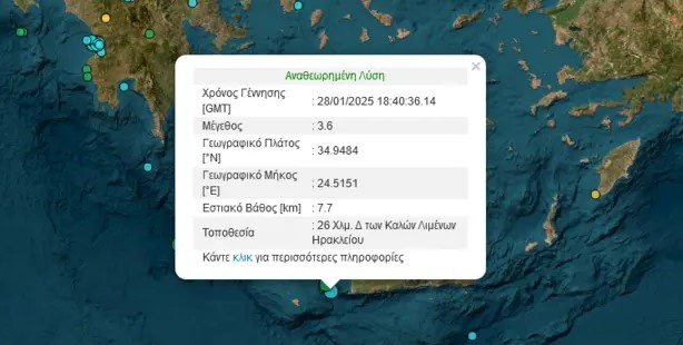 Σεισμός 3,6 Ρίχτερ σημειώθηκε είκοσι λεπτά πριν από τις 21.00 το βράδυ της Τρίτης στη θαλάσσια περιοχή νότια του νομού Ηρακλείου.