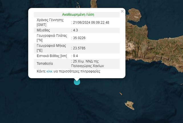 Σύμφωνα με το Γεωδυναμικό Ινστιτούτο του Εθνικού Αστεροσκοπείου Αθηνών, το επίκεντρο της δόνησης εντοπίζεται στον θαλάσσιο χώρο 25 χιλιόμετρα νότια νοτιοδυτικά της Παλαιοχώρας Χανίων.