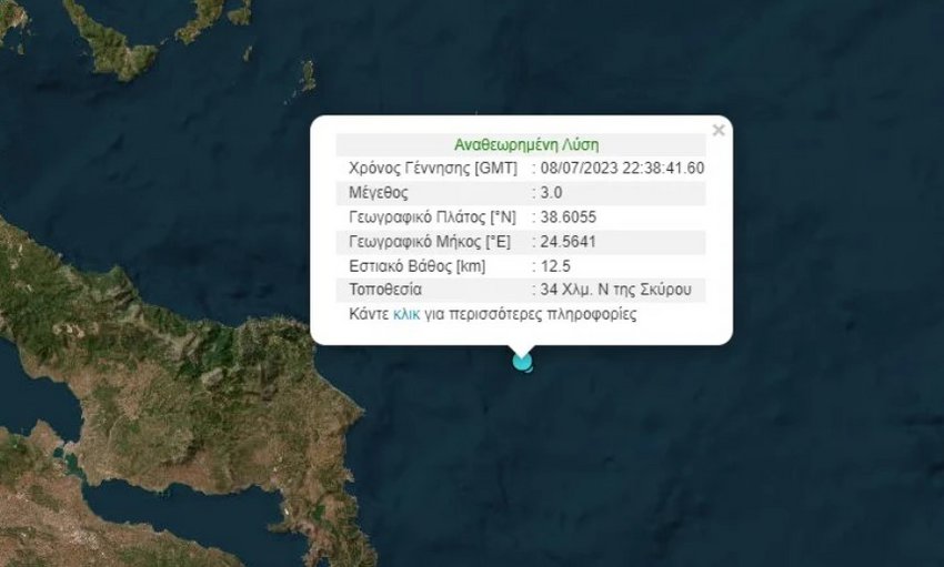 Συγκεκριμένα, σύμφωνα με την αναθεωρημένη λύση του Γεωδυναμικού Ινστιτούτου Αθηνών, ο πρώτος σεισμός καταγράφηκε στη 1:38 τα ξημερώματα στα 34 χιλιόμετρα νότια της Σκύρου και είχε εστιακό βάθος 12,5 χιλιόμετρα, ενώ η δεύτερη σεισμική δόνηση σημειώθηκε στη 1:43 στα 33 χιλιόμετρα νότια της Σκύρου και είχε το ίδιο εστιακό βάθος.