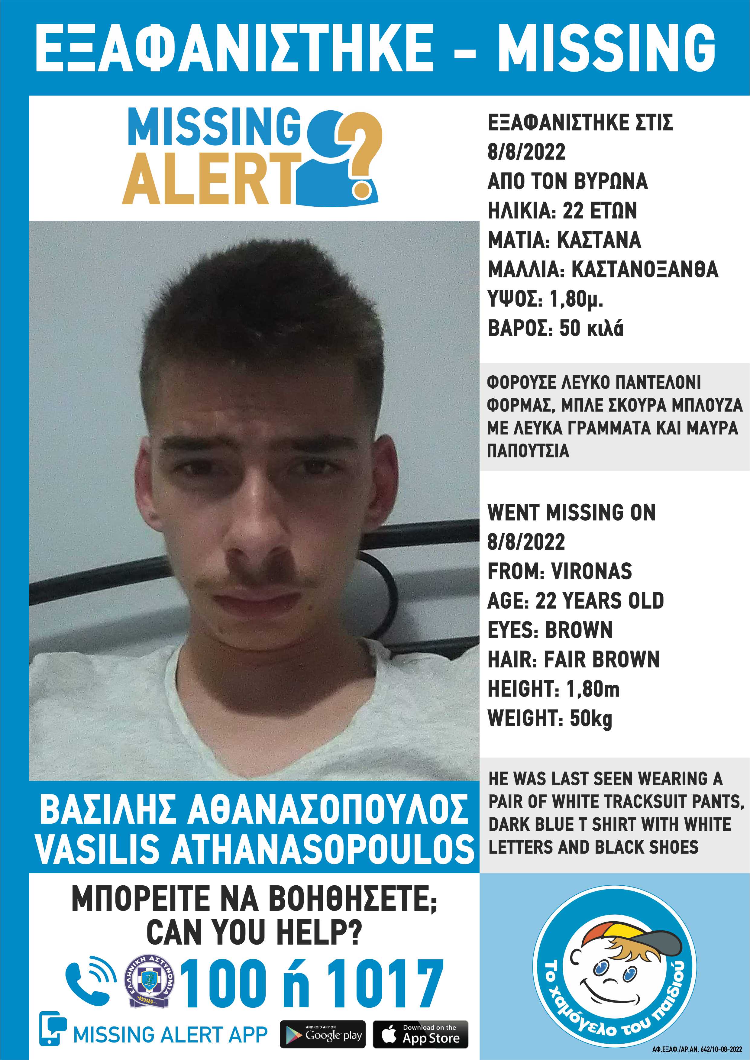 Συναγερμός έχει σημάνει στον Βύρωνα μετά την εξαφάνιση του 22χρονου Βασίλη Αθανασόπουλου την Δευτέρα 8 Αυγούστου.