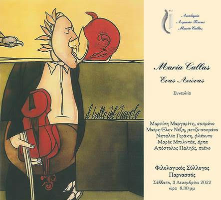 Η πρώτη, είναι η Συναυλία στις 3 Δεκεμβρίου 2022, στον «Παρνασσό», πού περιλαμβάνει άριες από όπερες αλλά και μουσικά κομμάτια, εμπνευσμένα από αυτές. Συμμετέχουν οι καλλιτέχνες: Μυρσίνη Μαργαρίτη, υψίφωνος, Μαίρη-΄Ελεν Νέζη, μεσόφωνος, Ναταλία Γεράκη, φλάουτο, Μαρία Μπιλντέα, άρπα και Απόστολος Παληός, πιάνο.