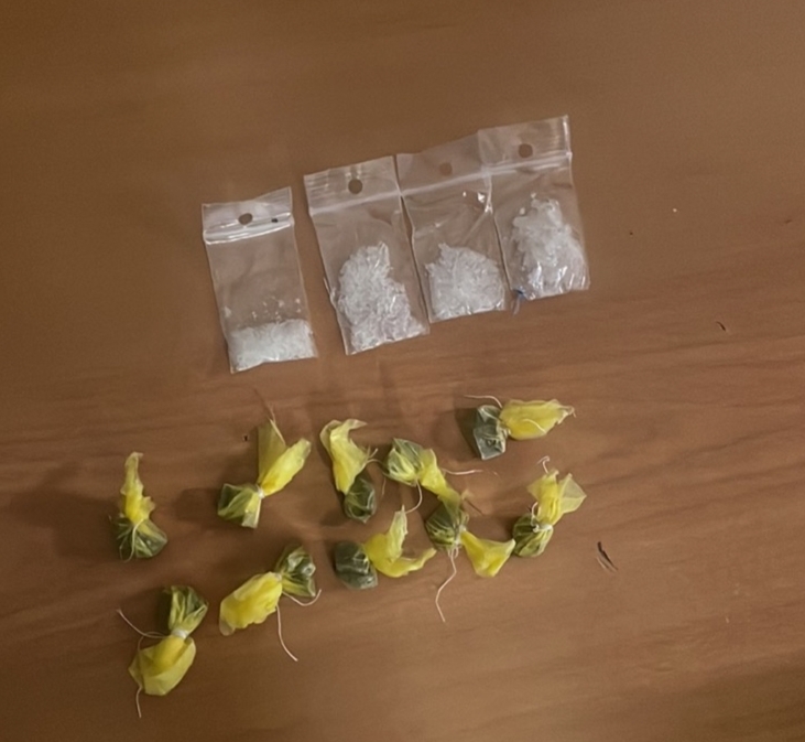 Σε σωματική έρευνα που διενεργήθηκε στον 26χρονο, εντοπίστηκαν στην κατοχή του και κατασχέθηκαν: Δέκα αυτοσχέδιες συσκευασίες με ηρωϊνη 9,7 γραμμαρίων, 4 νάϊλον συσκευασίες με κρυσταλλική μεθαμφεταμίνη 4,2 γραμμαρίων και το χρηματικό ποσό των 70 ευρώ.