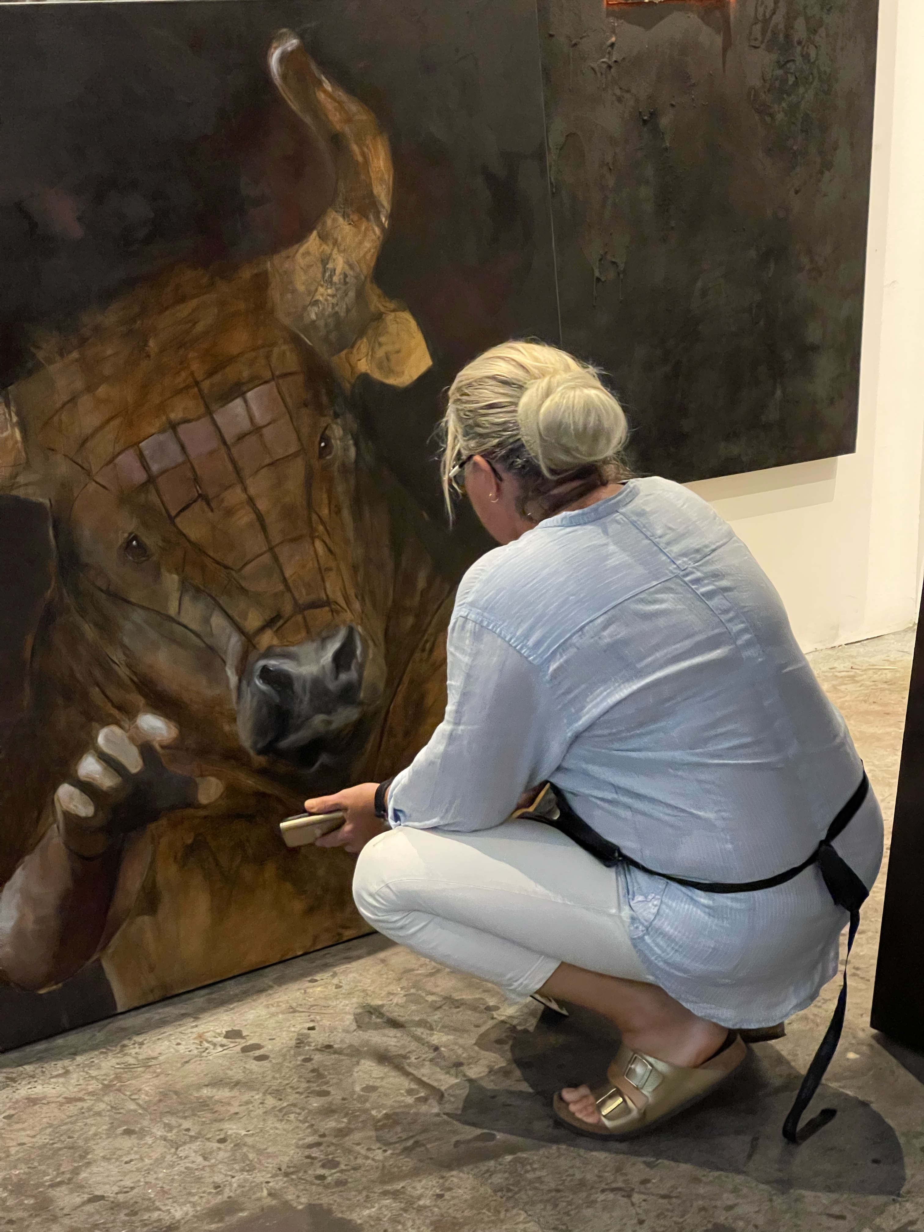 Πίνακες μεγάλου μεγέθους που απεικονίζουν τον ταύρο στη μυθική του υπόσταση, ελαιογραφίες μέσα στις οποίες το φως καταφέρνει να κερδίσει το σκοτάδι, δημιουργούν εντύπωση και προβληματισμό στο κοινό που επισκέπτεται τον χώρο και  έχει την  ευκαιρία να τον ξεναγήσει η ίδια η εικαστικός.