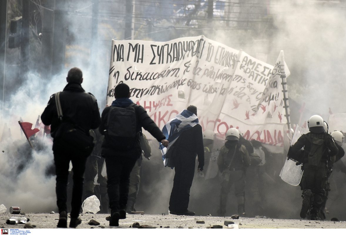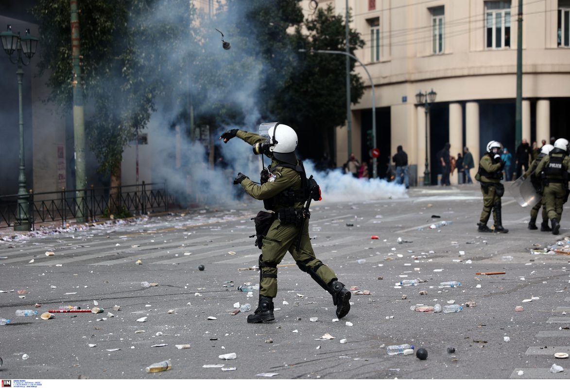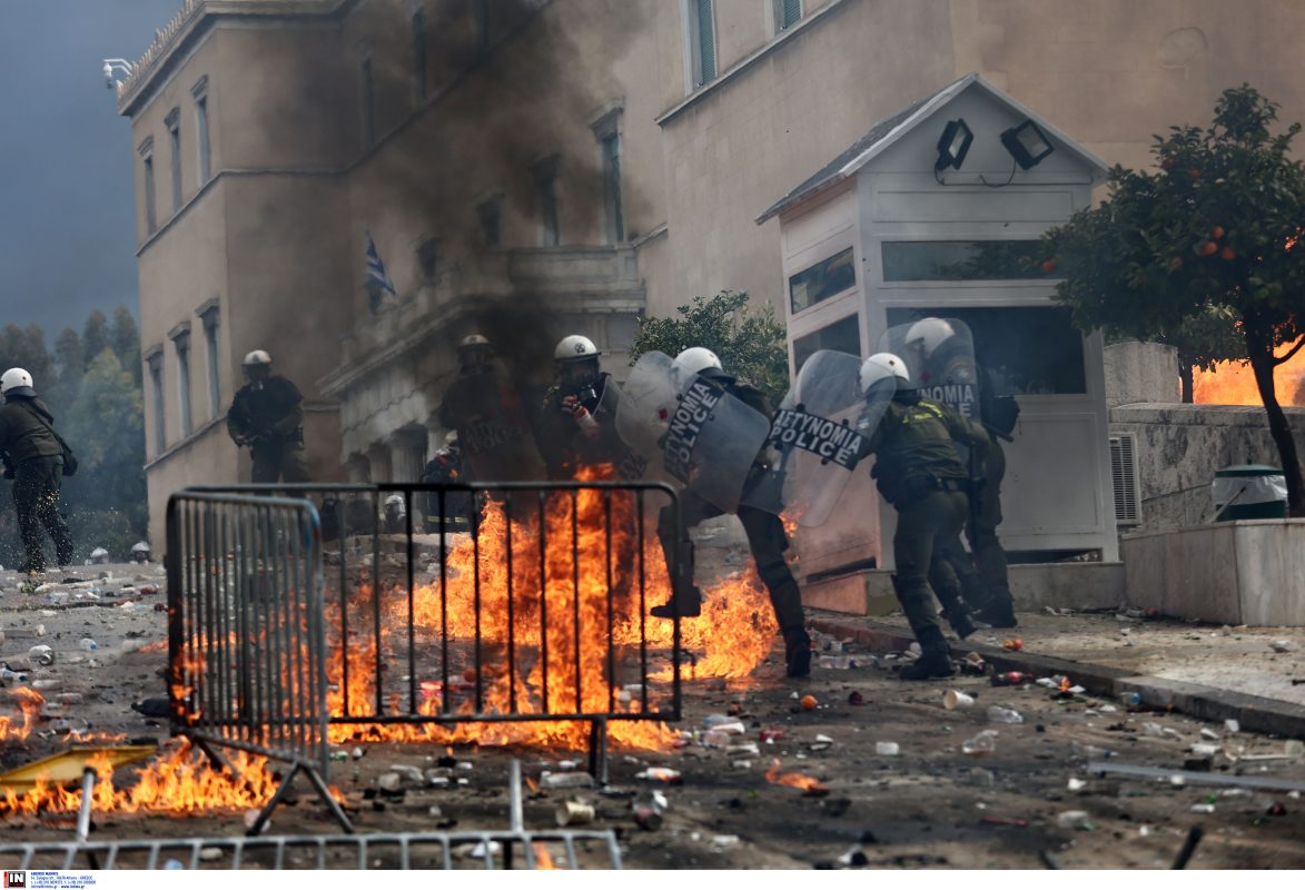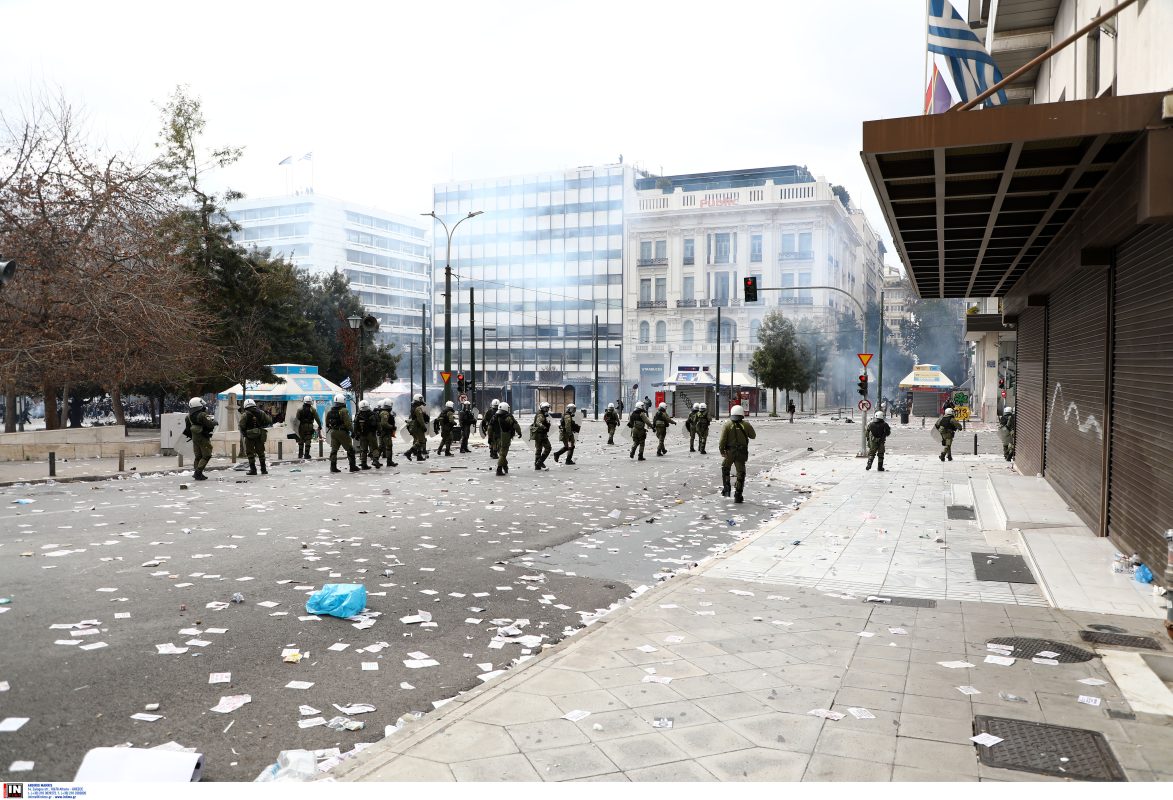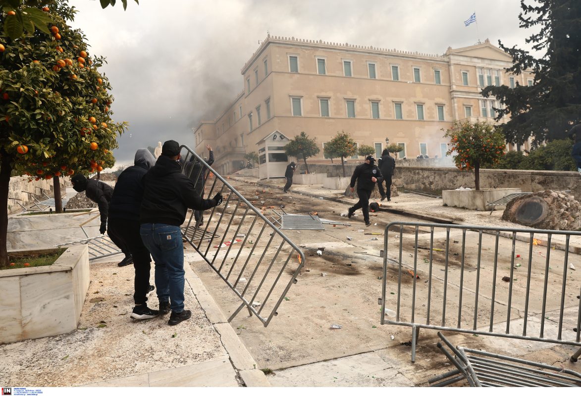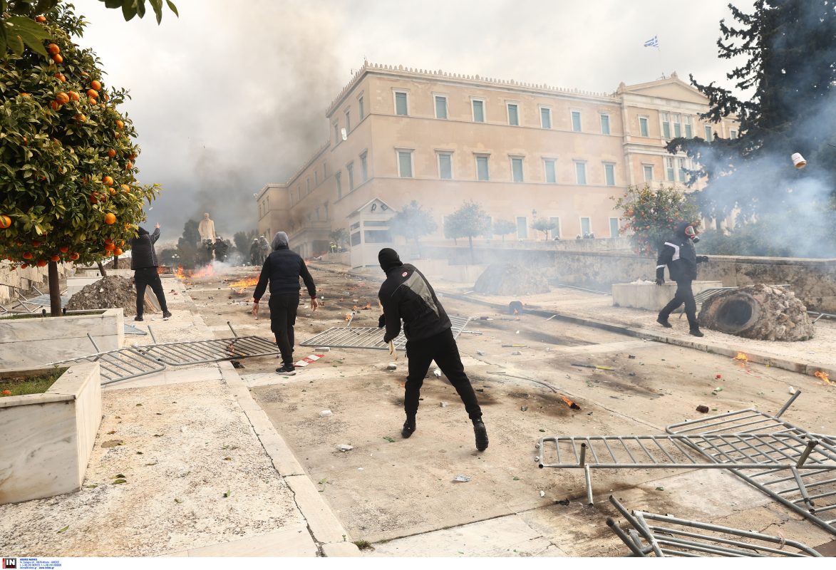 Το «κοκτέιλ» αντιεξουσιαστών και χούλιγκαν έσπασε μάρμαρα από την Μ. Βρετάνια, τα σκαλοπάτια της πλατείας Συντάγματος και παράλληλα εκσφενδόνισαν εκατοντάδες βόμβες μολότοφ, οι περισσότερες εξ αυτών «εκρηκτικές». Παράλληλα επιχείρησαν ν’ αμαυρώσουν το μνημείο του Αγνώστου Στρατιώτη, πετώντας μολότοφ σε σκοπιά Εύζωνα.