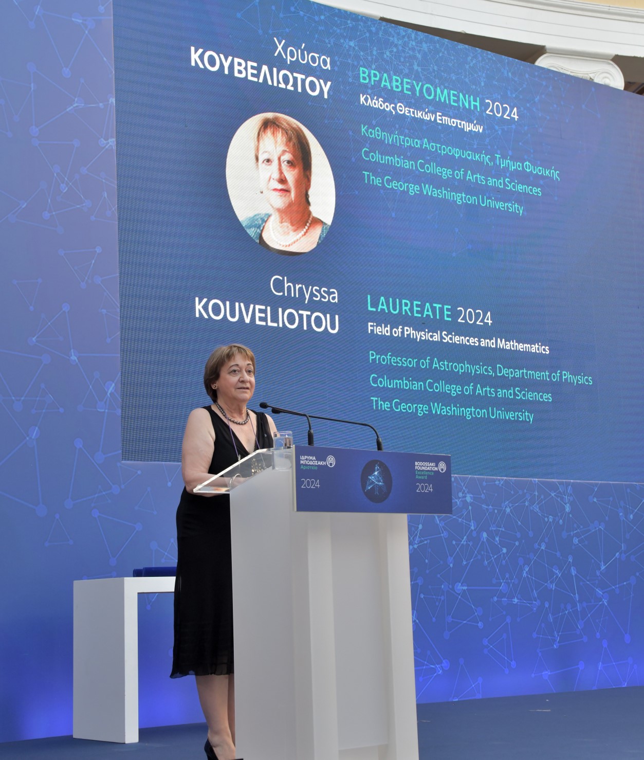 «Η Χρύσα Κουβελιώτου ανήκει ξεκάθαρα στους κορυφαίους επιστήμονες του κλάδου της διεθνώς», τόνισε ο Καθηγητής Daan Frenkel, συμπληρώνοντας πως «η ανακάλυψη της, αυτή των μαγνάστρων (magnetars), των αστέρων νετρονίων με ακραία μαγνητικά πεδία, καθώς και η έρευνά της στις εκλάμψεις ακτίνων γ συναρπάζει ακόμη και σήμερα τους αστρονόμους στον ίδιο βαθμό, όπως και πριν από 25 χρόνια όταν παρουσίαζε τα πρώτα αποτελέσματα των μελετών της. Επιπλέον, η Χρύσα Κουβελιώτου αποτελεί ένα εξαιρετικό πρότυπο», ανέφερε ο Καθηγητής Daan Frenkel, τονίζοντας «πόσο δύσκολη και ταυτόχρονα εύκολη ήταν η επιλογή του νικητή του Αριστείου Μποδοσάκη για τις Θετικές Επιστήμες διότι υπάρχουν απλώς τόσοι πολλοί πραγματικά εξαιρετικοί Έλληνες επιστήμονες που είναι ενεργοί στον κλάδο των Θετικών Επιστημών».