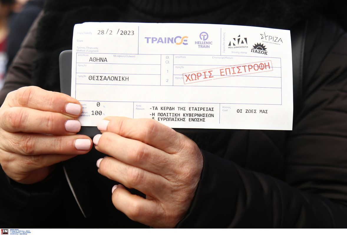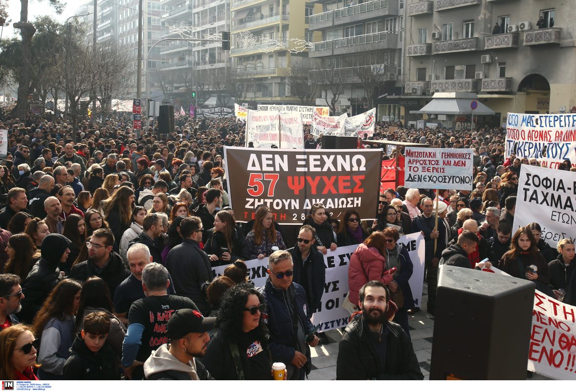 Στην κεντρική συγκέντρωση, στο άγαλμα του Βενιζέλου, η μητέρα ενός από τα θύματα της τραγωδίας, Ελένη Βασσάρα, συγγενείς θυμάτων και εκπρόσωποι σιδηροδρομικών και σωματείων εργαζομένων απαίτησαν «την πλήρη διερεύνηση και διαλεύκανση των συνθηκών και των αιτιών του δυστυχήματος» και την απόδοση ευθυνών «σε φυσικούς και ηθικούς αυτουργούς», καθώς και την «καταδίκη των πολιτικών που έφεραν το σιδηρόδρομο σε αυτήν την κατάσταση», ζητώντας παράλληλα τη «δικαίωση των θυμάτων» και «ασφαλή σιδηρόδρομο». «Είναι ημέρα μνήμης και ημέρα αγώνα για την απόδοση δικαιοσύνης. Πολλοί επιζήσαντες είναι τραυματισμένοι ψυχικά. Το πένθος μας γίνεται πένθος όλης της χώρας» είπε η κ. Βασσάρα.