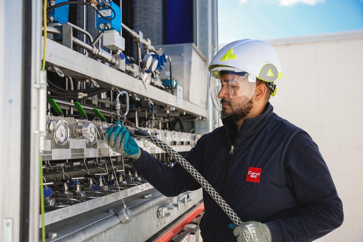 Η Coral Gas ανέλαβε την προμήθεια και μεταφορά από το εξωτερικό, και εν συνεχεία αποθήκευση του πράσινου υδρογόνου για τη λειτουργία του πρατηρίου. Στο μέλλον η πλήρωση των trailers θα γίνεται στο σταθμό φόρτωσης υδρογόνου που κατασκευάζει η Motor Oil στο διυλιστήριο.