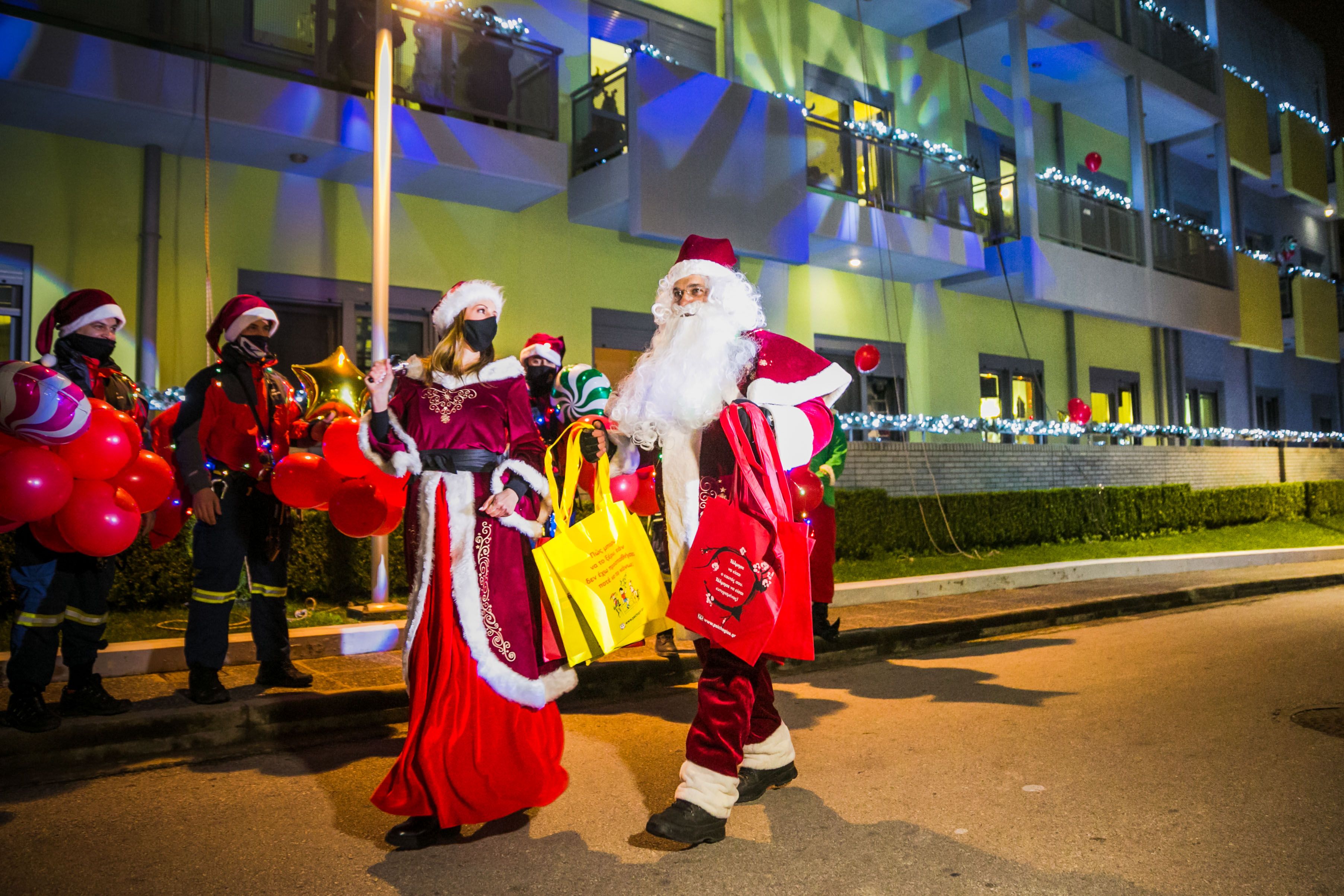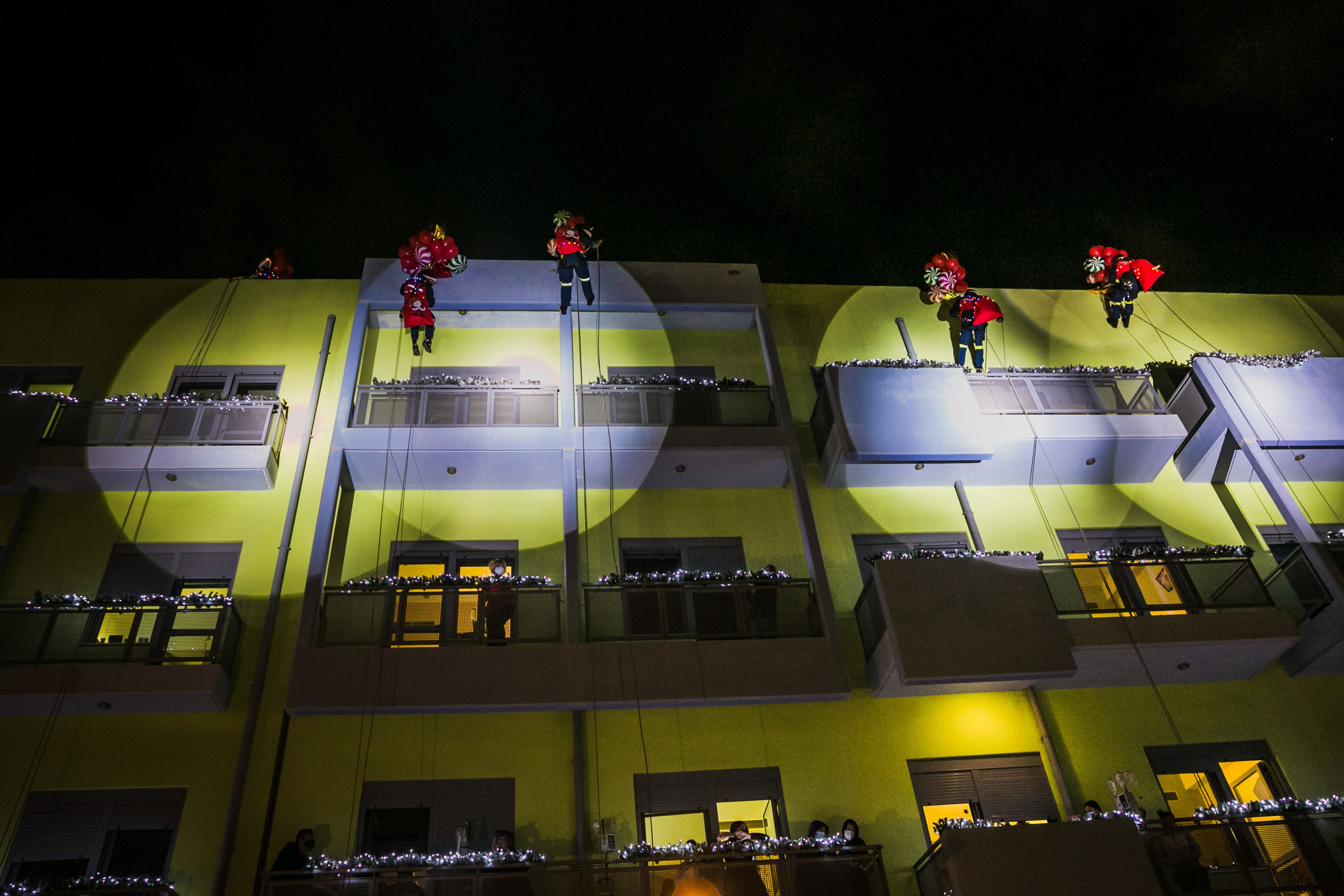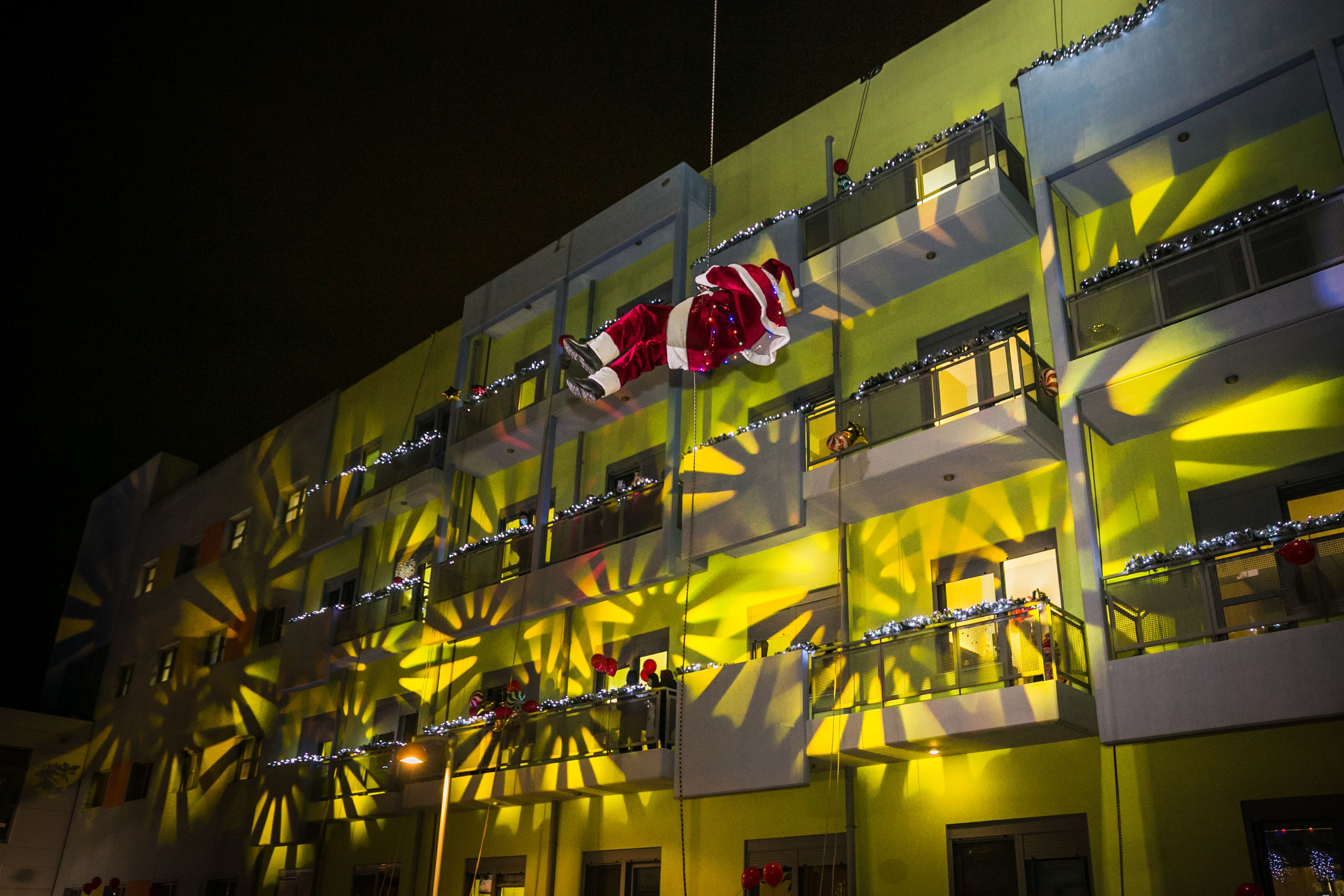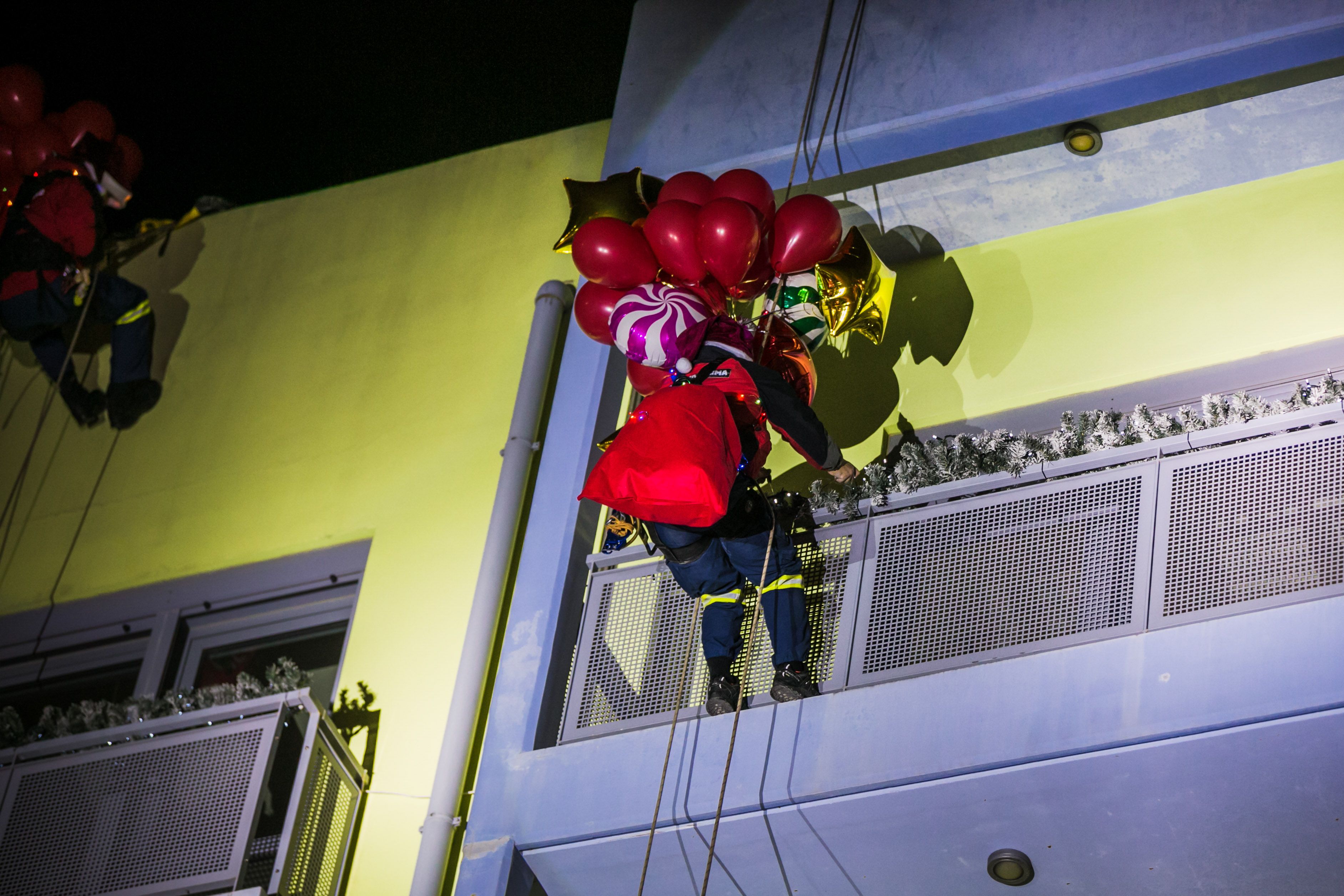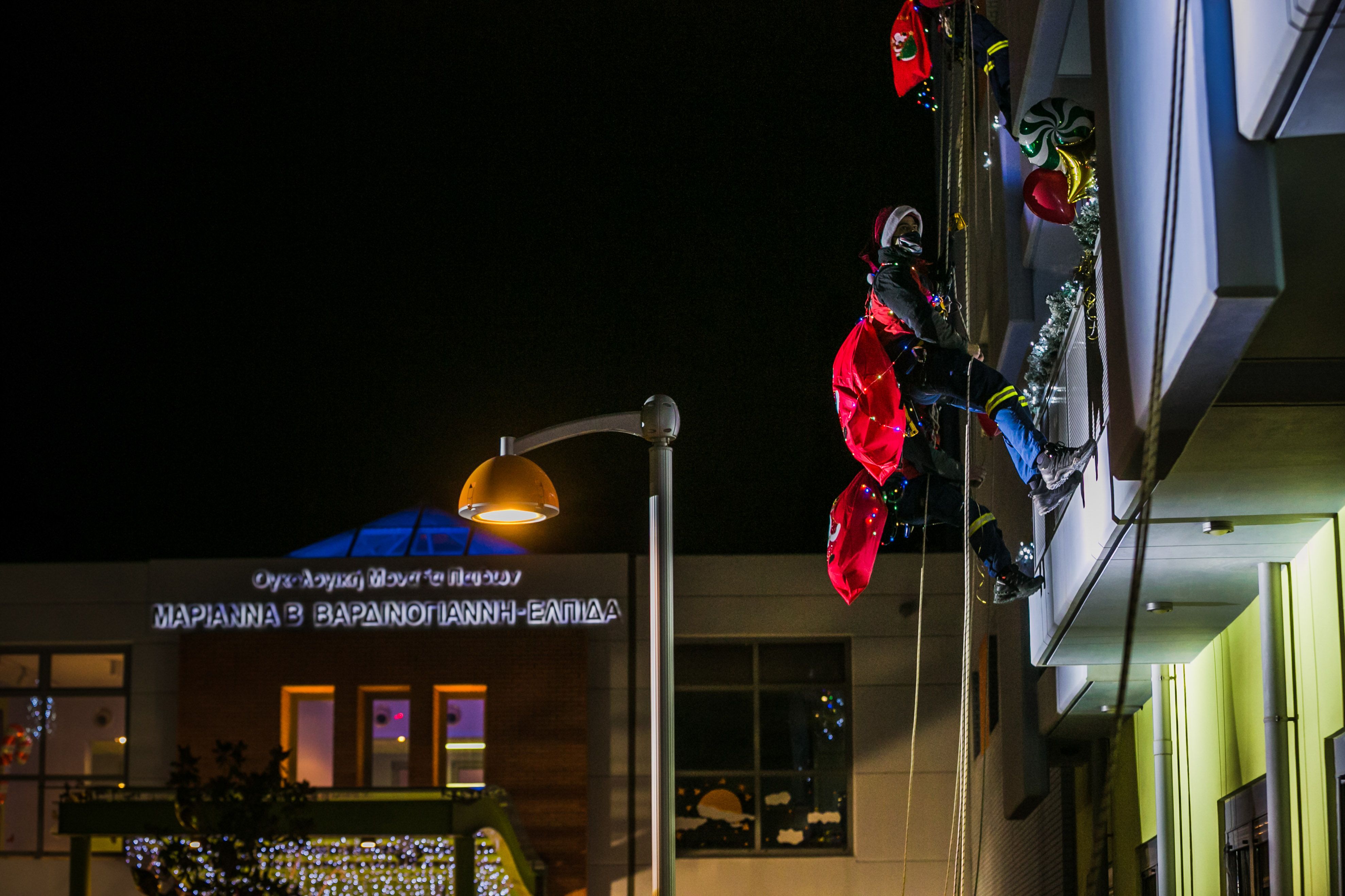 Το μαγικό σκηνικό στήθηκε νωρίς το απόγευμα της Τετάρτης όταν «ιπτάμενοι πυροσβέστες» ξεκίνησαν να κατεβαίνουν από την οροφή του κτιρίου με σχοινιά, προσφέροντας μπαλόνια και δώρα στα παιδιά που τους περίμεναν με ανυπομονησία στα παράθυρα των δωματίων τους.