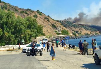 Στο σημείο επιχειρούν 18 πυροσβέστες με 5 οχήματα και ειδικό βραχιονοφόρο όχημα.