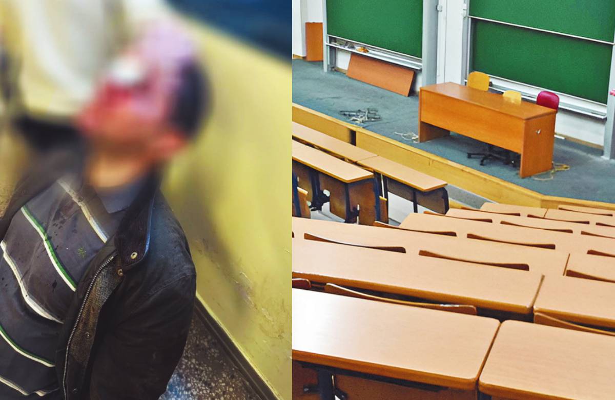 Αρχικά επιτέθηκαν στους παρευρισκομένους, αδειάζοντας έναν πυροσβεστήρα. Οι νεαροί κουκουλοφόροι στράφηκαν εναντίον των καθηγητών που βρίσκονταν έξω από την αίθουσα και συζητούσαν.