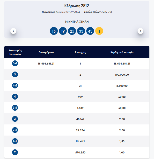 Οι τυχεροί αριθμοί στην κλήρωση ΤΖΟΚΕΡ είναι οι εξής: 15, 19, 25, 33, 43 και ΤΖΟΚΕΡ ο αριθμός: 1.