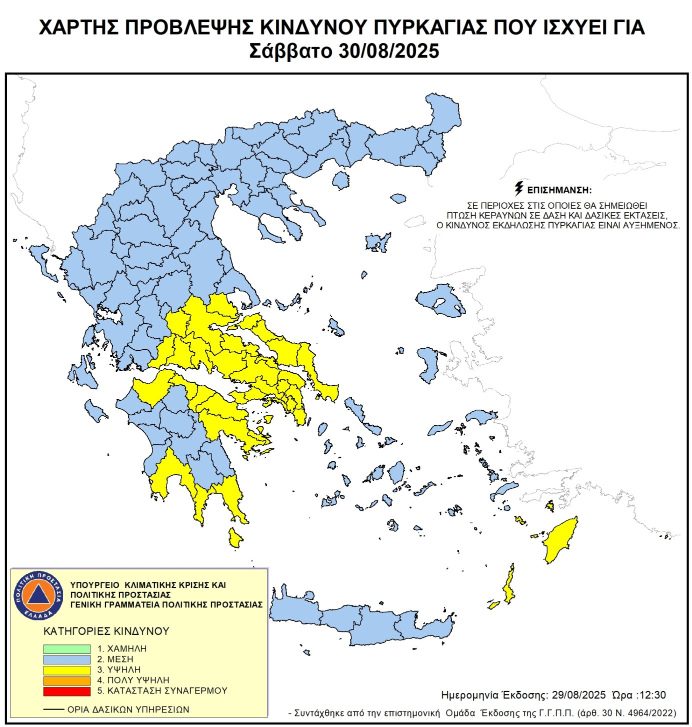 Με τους ισχυρούς ανέμους να επιμένουν, αυξημένος και για σήμερα Σάββατο 30 Αυγούστου είναι ο κίνδυνος πυρκαγιάς στη χώρα. Σύμφωνα με τον Χάρτη πρόβλεψης κινδύνου πυρκαγιάς που εκδίδει η Γενική Γραμματεία Πολιτικής Προστασίας, προβλέπεται υψηλός κίνδυνος πυρκαγιάς (κατηγορία 3) για τις εξής περιοχές: