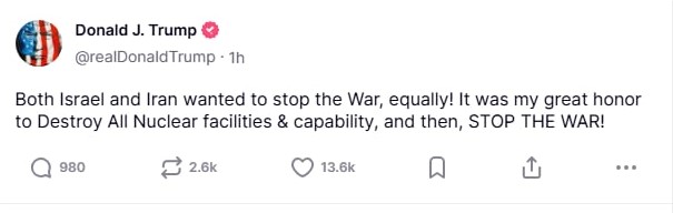 «Τόσο το Ισραήλ όσο και το Ιράν ήθελαν εξίσου να σταματήσουν τον πόλεμο. Ήταν μεγάλη μου τιμή να καταστρέψω όλες τις πυρηνικές εγκαταστάσεις (του Ιράν) και δυνατότητες και, στη συνέχεια, να σταματήσω τον πόλεμο!» έγραψε στην ανάρτησή του.