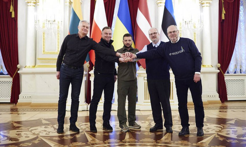 Οι αρχηγοί των τεσσάρων κρατών μελών της Ευρωπαϊκής Ένωσης και του ΝΑΤΟ (Λετονίας, Πολωνίας, Εσθονίας, Λιθουανίας) ταξίδεψαν με τρένο στο Κίεβο σε ένδειξη αλληλεγγύης στις προσπάθειες της Ουκρανίας να αντιμετωπίσει τη ρωσική εισβολή. Πριν συναντήσουν τον Ουκρανό πρόεδρο Βολοντίμιρ Ζελένσκι την Τετάρτη, οι τέσσερις ηγέτες επισκέφτηκαν περιοχές που έχουν υποστεί σοβαρές ζημιές γύρω από το Κίεβο.