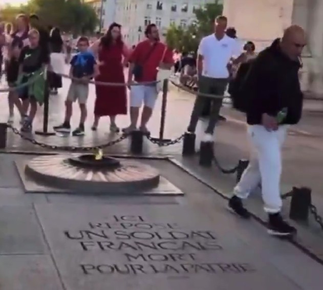 Η εφημερίδα Le Figaro μεταδίδει ότι μια τουρίστρια από τη Λετονία βιντεοσκόπησε την ανάρμοστη πράξη επισκέπτη στο μνημείο του Άγνωστου Στρατιώτη στο Παρίσι «τη Δευτέρα 4 Αυγούστου, λίγο πριν από τις 9 το βράδυ».