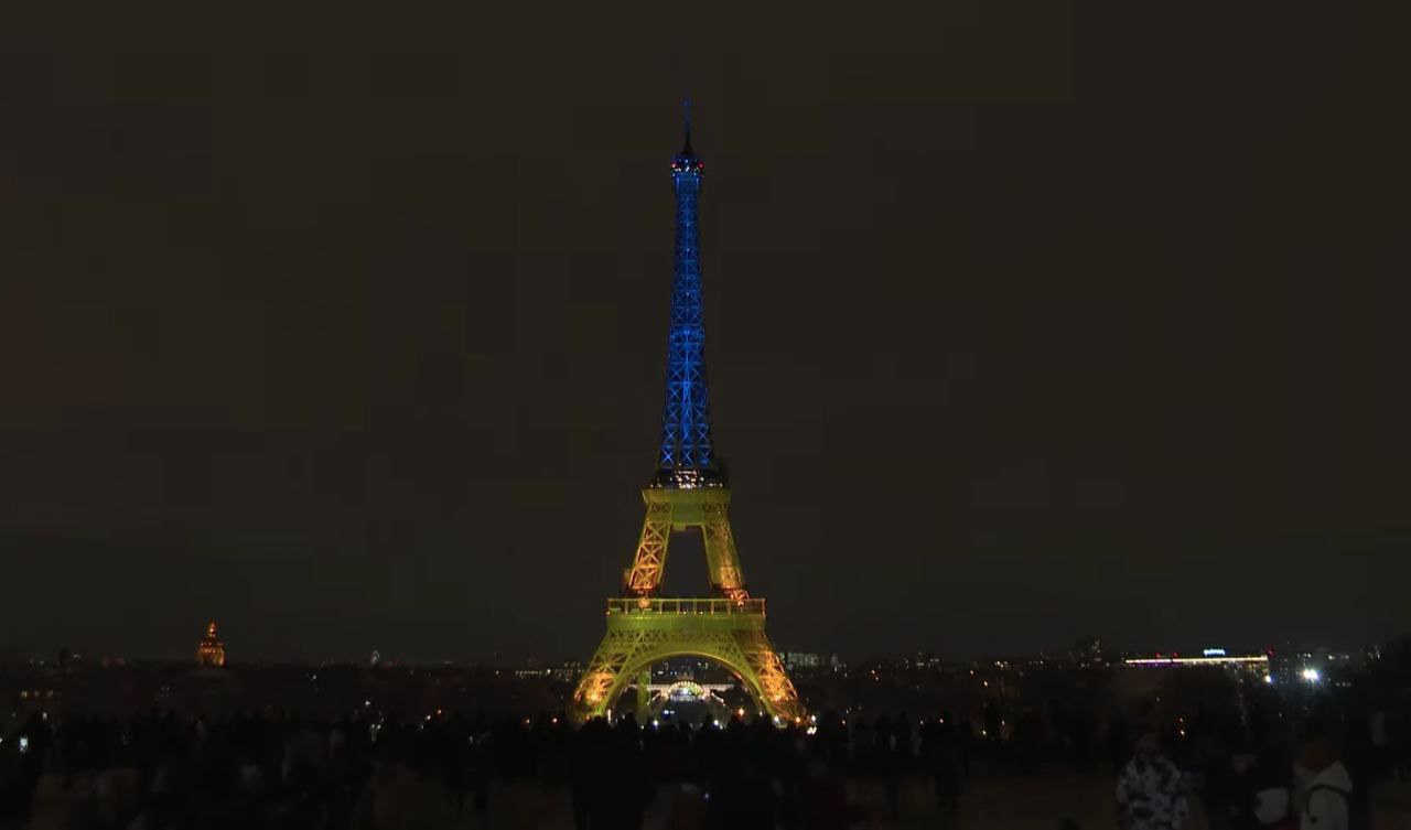 Ο Πύργος του Άιφελ φωταγωγήθηκε απόψε στα χρώματα της ουκρανικής σημαίας, με αφορμή τη συμπλήρωση ενός χρόνου από την έναρξη της ρωσικής εισβολής στην Ουκρανία.