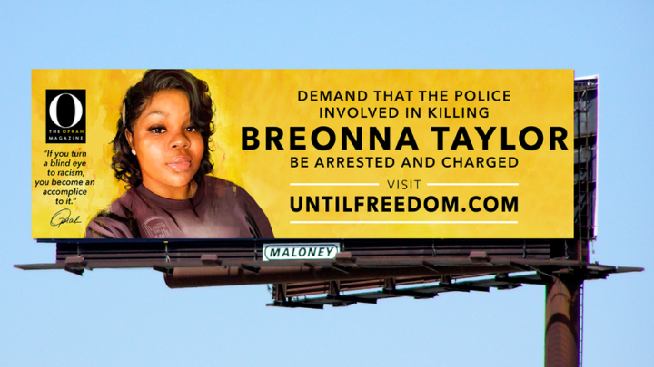 Το βίντεο δείχνει πινακίδες γύρω από το Λούισβιλ που φέρουν το όνομα και το πρόσωπο της Τέιλορ, η οποία έχασε τη ζωή της από πυρά αστυνομικών.