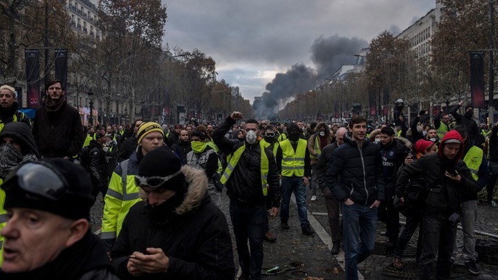 «Μανύ, απατεώνα» (Manu imposteur), γράφει το τεράστιο πλακάτ που απευθύνεται στον Εμανουέλ (Μανύ) Μακρόν, με φόντο την Αψίδα του Θριάμβου. Το κρατά ψηλά ομάδα διαδηλωτών ντυμένων με κίτρινα γιλέκα όπως οι χιλιάδες που κατέκλυσαν σιγά σιγά τη λεωφόρο των Ηλυσίων.