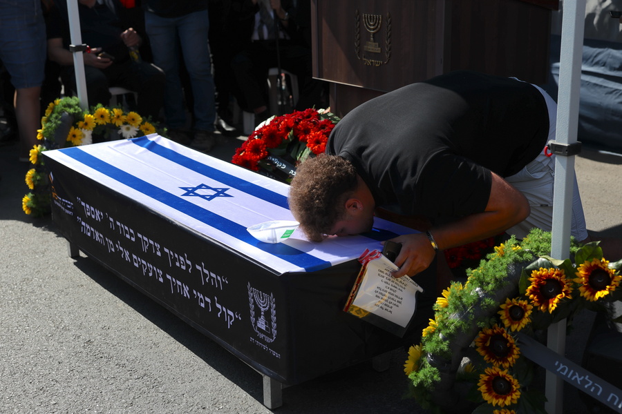 epa12464318 A person mourns on the coffin of late Israeli hostage Uriel Baruch during his funeral procession in Jerusalem, 19 October 2025. Baruch was kidnapped by Hamas on 07 October 2023 at the Nova music festival and killed in captivity. His body was returned as part of a ceasefire agreement between Israel and Hamas. EPA/ABIR SULTAN