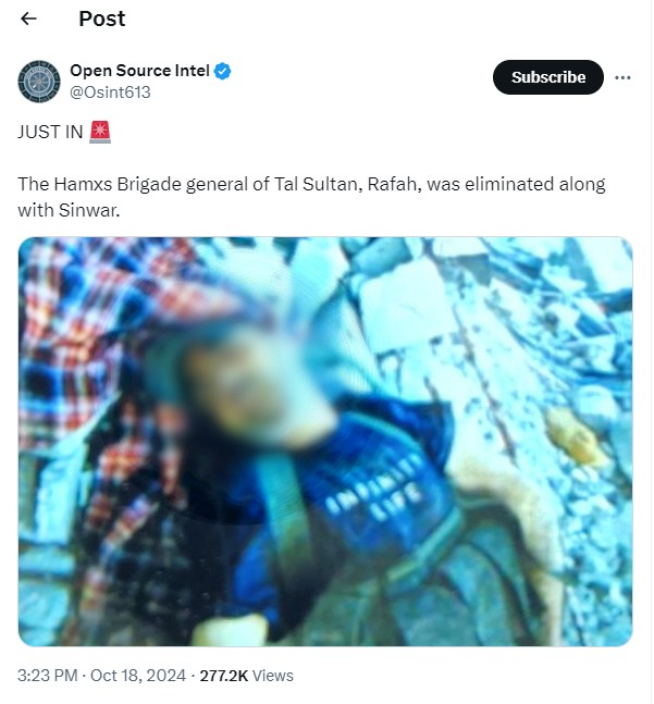 Σήμερα (Παρασκευή), ο Μαχμούντ Χαμντάν εξουδετερώθηκε από τις IDF κατά τη διάρκεια μιας σύγκρουσης με τα στρατεύματα των IDF, περίπου 200 μέτρα από το σημείο όπου εξουδετερώθηκε ο Σινουάρ».