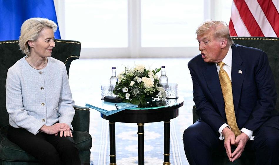 Ερωτηθείσα για τη συνάντησή της με τον Αμερικανό Πρόεδρο που διήρκησε περίπου μία ώρα, η πρόεδρος της Επιτροπής είπε ότι οι συνομιλίες ήταν «δύσκολες» και «δίκαιες», αλλά κυρίως «δύσκολες» και χαρακτήρισε το αποτέλεσμα «καλό» και «ικανοποιητικό». Παραδέχτηκε ότι οι τελωνειακοί δασμοί 15% είναι σίγουρα μια πρόκληση για ορισμένους, αλλά διατηροόυν την πρόσβαση στην αμερικανική αγορά. Σημείωσε, τέλος, ότι η ΕΕ προσπαθεί να ανοίξει νέες αγορές για τις ευρωπαϊκές επιχειρήσεις.