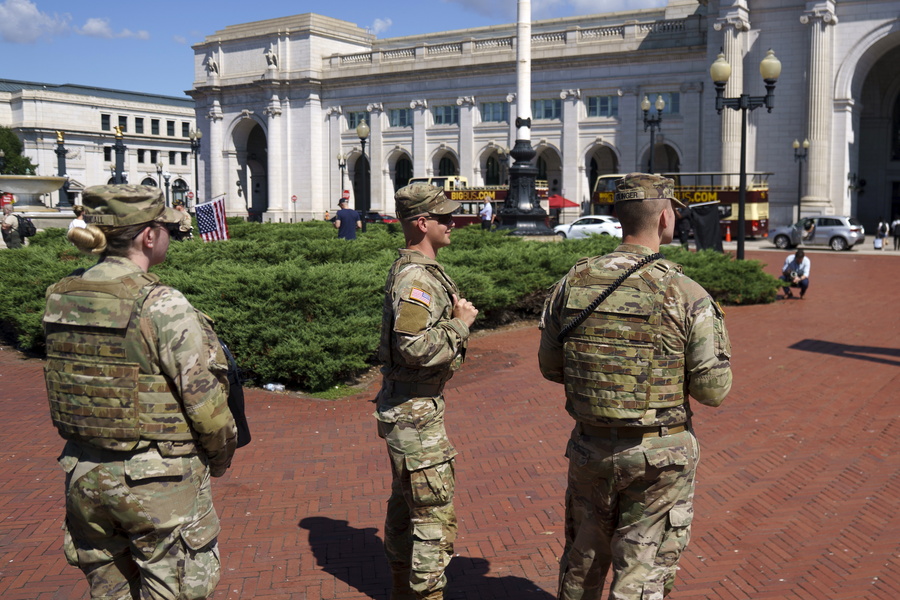 epa12321877 Members of the National Guard on patrol at Union Station in Washington DC, USA, 25 August 2025. As the second week of U.S. President Donald Trump’s takeover of Washington, D.C., policing begins, Mississippi joins three other Republican-led states that have vowed to deploy National Guard members in support of the Trump administration’s operation. EPA/WILL OLIVER
