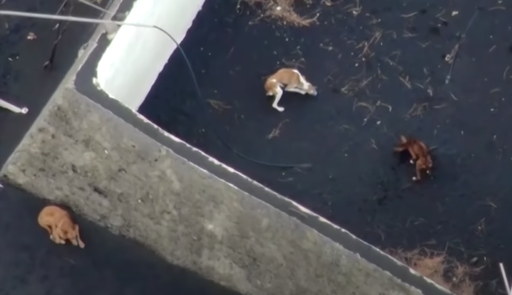 Ωστόσο αρκετά αδυνατισμένα σκυλιά βρίσκονται ακόμη στο νησί, στριμωγμένα γύρω από μια περιτοιχισμένη αυλή καλυμμένη με στάχτη, αποκομμένη λόγω της ηφαιστειακής λάβας στην ορεινή περιοχή Todoque, και διατηρούνται ζωντανά με δέματα τροφίμων που παραδίδονται από drones.