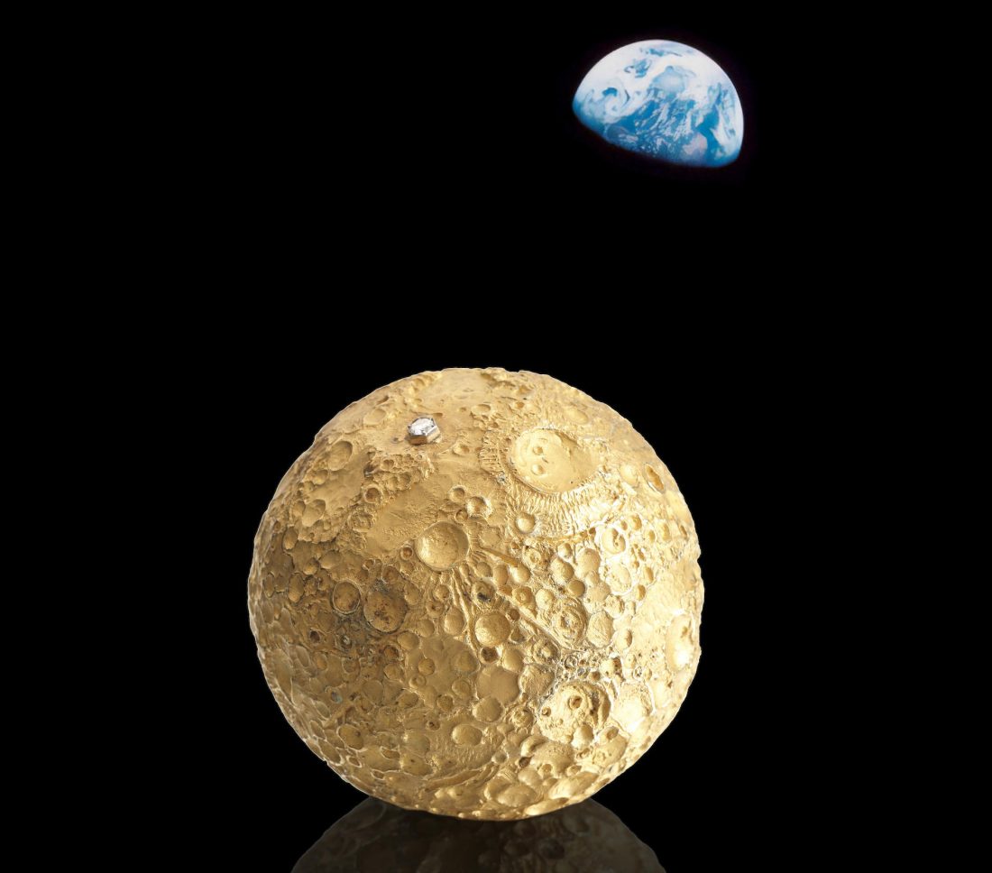 Ένα εντυπωσιακό και απόλυτα λεπτομερές γλυπτό, κατασκευασμένο από χρυσό 22 cts και διακοσμημένο με ένα διαμάντι, αποτίει φόρο τιμής στη διαστημική αποστολή του Apollo 11 και στην επιτυχημένη προσελήνωσή του το 1969.