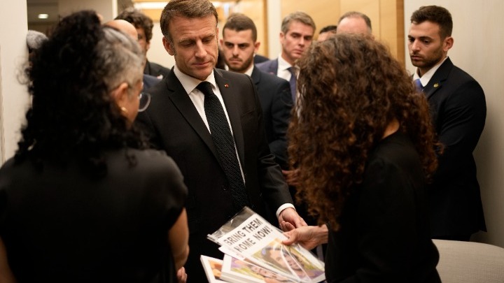 Στο αεροδρόμιο του Τελ Αβίβ σήμερα το πρωί ο Μακρόν συναντήθηκε με οικογένειες Γάλλων ή Γαλλοϊσραηλινών που σκοτώθηκαν κατά την επίθεση ή κρατούνται όμηροι στη Λωρίδα της Γάζας.