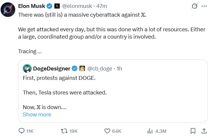 «Σημειώθηκε (ακόμη είναι σε εξέλιξη) μια μαζική κυβερνοεπίθεση εναντίον του Χ. Δεχόμαστε επιθέσεις καθημερινά, αλλά αυτή έγινε με πολλούς πόρους. Εμπλέκεται είτε μια μεγάλη, συντονισμένη ομάδα και/ή μια χώρα» ανέφερε ο Μασκ σε ανάρτησή του στην πλατφόρμα.
