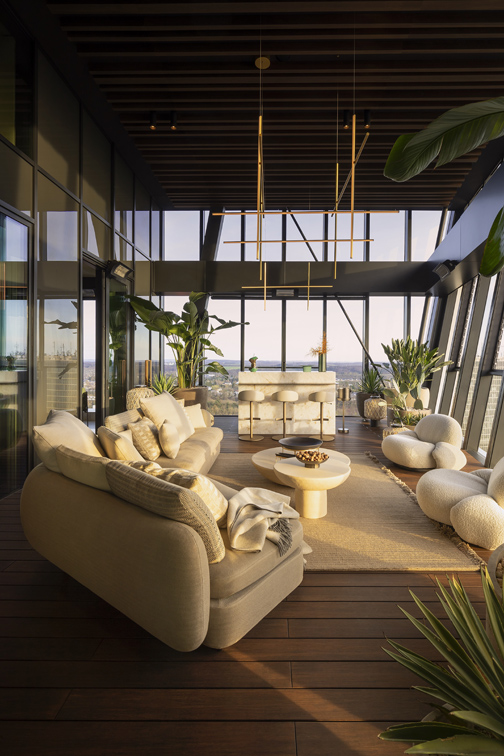 Η ζεστασιά και τα χρώματα της Μεσογείου διατρέχουν το εσωτερικό αυτού του κομψού ρετιρέ, που δεσπόζει από τον 26ο όροφο ενός νεόδμητου ουρανοξύστη στο Λουξεμβούργο.