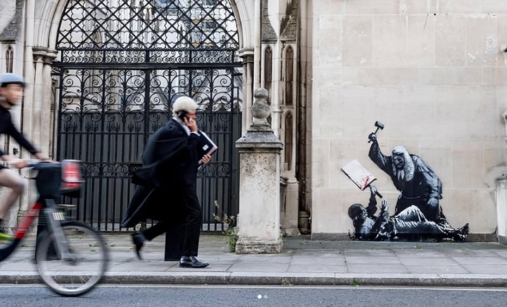Ένα νέο έργο του Banksy, που απεικονίζει έναν δικαστή με τήβεννο να χτυπά με σφυρί έναν ανυπεράσπιστο διαδηλωτή που βρίσκεται στο έδαφος κρατώντας ένα πλακάτ με ένα κόκκινο σημάδι, εμφανίστηκε στους τοίχους των Βασιλικών Δικαστηρίων στο κέντρο του Λονδίνου, πριν καλυφθεί γρήγορα από τους φρουρούς ασφαλείας.