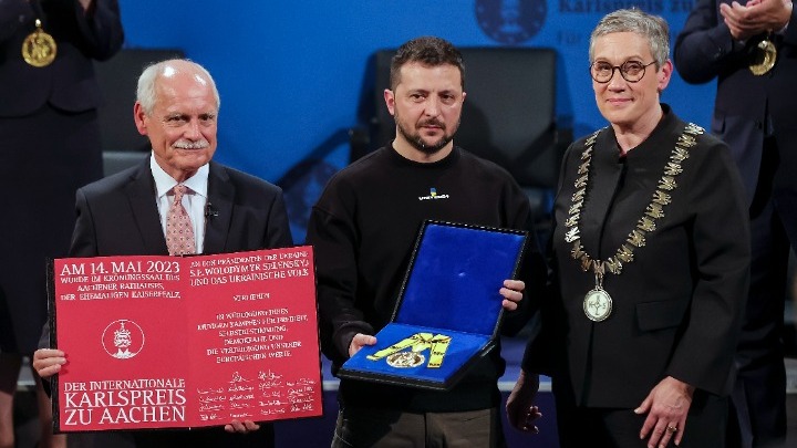 Ο κ. Ζελένσκι έφθασε στο 'Ααχεν με τον καγκελάριο Όλαφ Σολτς, με στρατιωτικό ελικόπτερο από το Βερολίνο. Νωρίτερα στην καγκελαρία είχε ανακοινωθεί το μεγαλύτερο έως τώρα πακέτο βοήθειας από τη Γερμανία προς την Ουκρανία, ύψους 2,7 δισ. ευρώ. Ο Ουκρανός πρόεδρος ευχαρίστησε κατ΄επανάληψη τη γερμανική ηγεσία και τον γερμανικό λαό για τη στήριξη και ζήτησε τον σχηματισμό «συμμαχίας των μαχητικών αεροσκαφών», προκειμένου, όπως είπε, να αποκτήσει επιτέλους η Ουκρανία σύγχρονη πολεμική αεροπορία.
