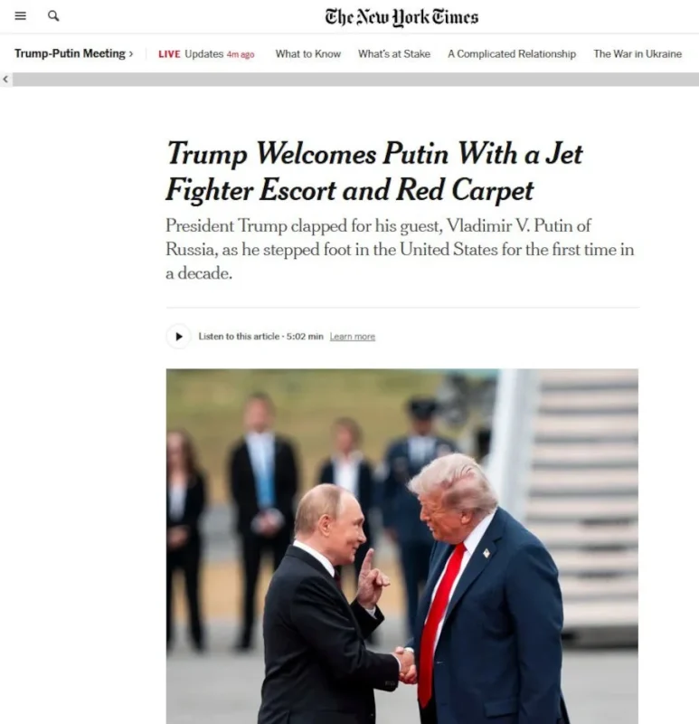 Στο ίδιο μήκος κύματος και οι Times της Νέας Υόρκης στις ΗΠΑ: «Ο Τραμπ έστρωσε το κόκκινο χαλί για τον Πούτιν. Δεν έχει ακόμη πετύχει ειρηνευτική συμφωνία».