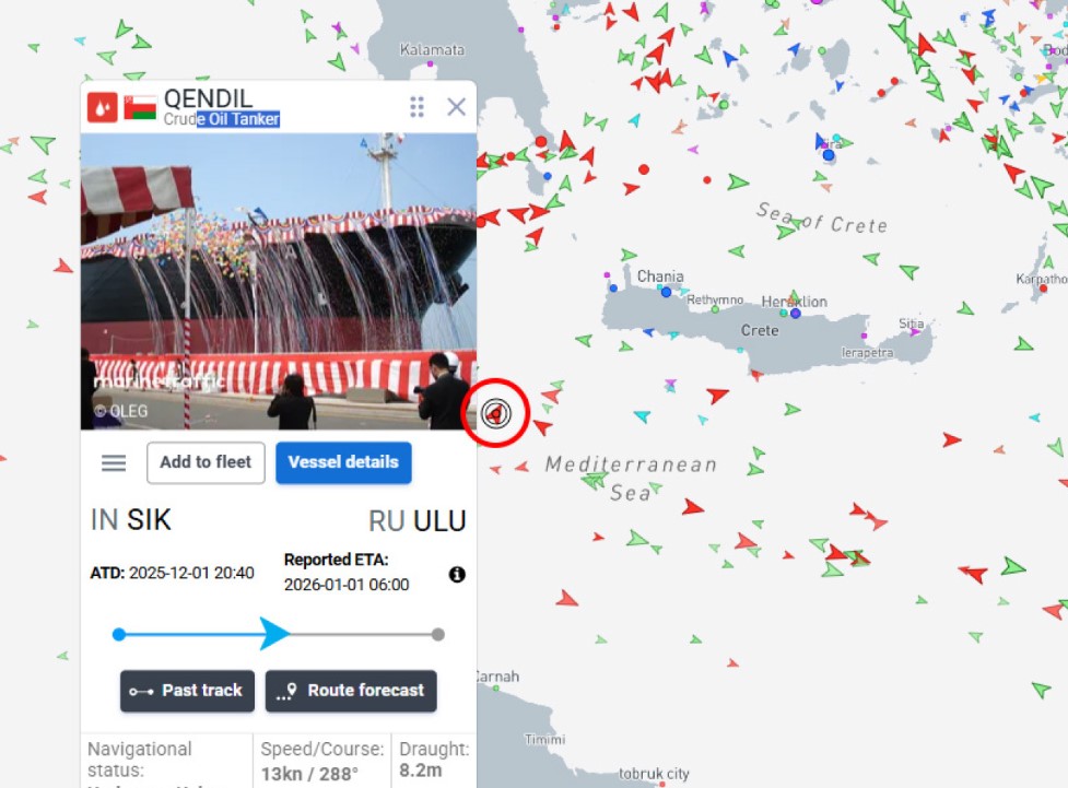 The Oman-flagged **QENDIL**, en route from India to Russia’s Ust-Luga, was struck by Ukrainian drones in neutral Mediterranean waters southeast of Greece—over 2,000 km from Ukraine.
