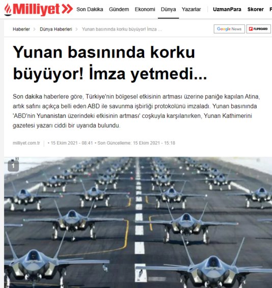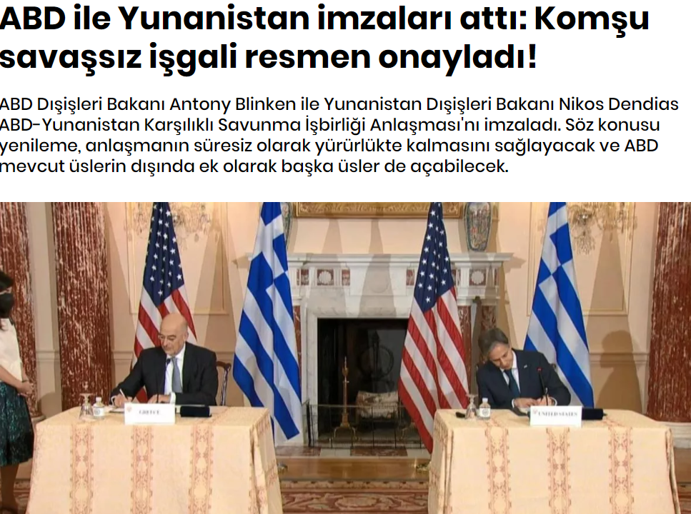 «Σύμφωνα με τις τελευταίες πληροφορίες, η Αθήνα, πανικοβλημένη από την αύξηση της περιφερειακής επιρροής της Τουρκίας, υπέγραψε ένα πρωτόκολλο αμυντικής συνεργασίας με τις Ηνωμένες Πολιτείες, οι οποίες δείχνουν πλέον ξεκάθαρα την εύνοιά της», αναφέρει η φιλο-κυβερνητική εφημερίδα.