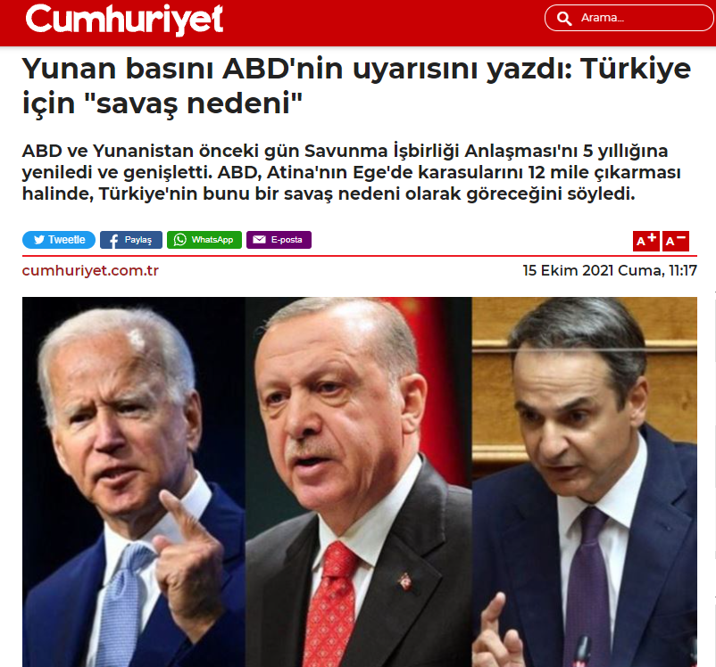 Σε άρθρο της η Cumhuriyet αναφέρει: «Ο ελληνικός Τύπος έγραψε την προειδοποίηση των ΗΠΑ: ''Αιτία πολέμου'' για την Τουρκία.