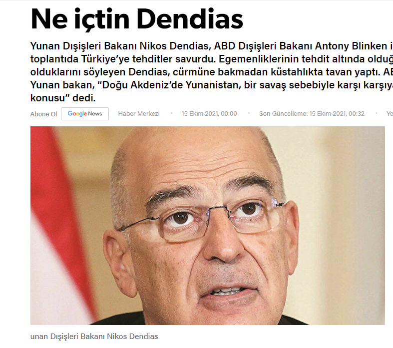 «Ο υπουργός Εξωτερικών της Ελλάδας, Νίκος Δένδιας, απείλησε την Τουρκία κατά τη συνάντηση που είχε με τον υπουργό Εξωτερικών των ΗΠΑ, Άντονι Μπλίνκεν. Ο Δένδιας, ο οποίος είπε ότι η κυριαρχία τους απειλείται και ότι είναι έτοιμοι για πόλεμο, ήταν αλαζονικός χωρίς να κοιτάζει το έγκλημά του. Ζητώντας υποστήριξη από τις Ηνωμένες Πολιτείες, ο Έλληνας υπουργός είπε, ‘Η Ελλάδα βρίσκεται αντιμέτωπη με μία απειλή πολέμου στην ανατολική Μεσόγειο. Υπάρχει απειλή πολέμου’, είπε», σημειώνει στην εισαγωγή της η εφημερίδα.