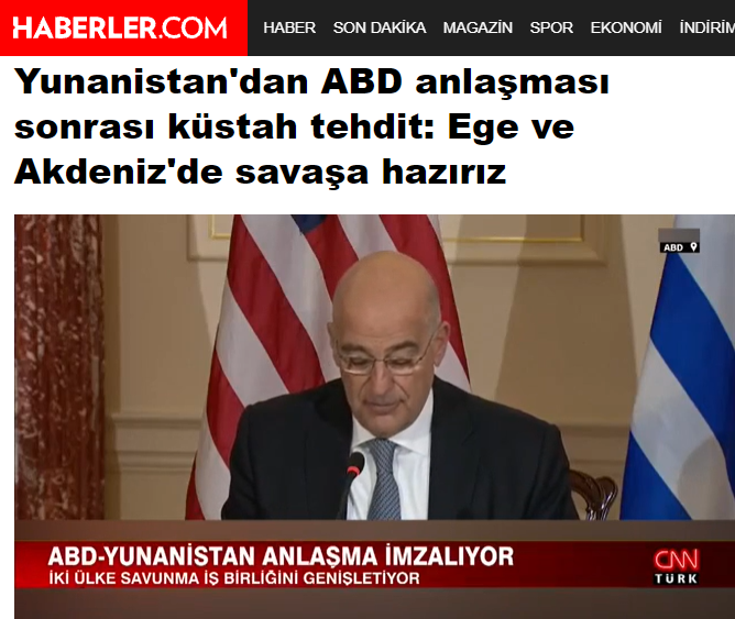 Το Haberler.com βλέπει «απειλή πολέμου» από την Ελλάδα. «Αλαζονική απειλή από την Ελλάδα μετά τη συμφωνία με τις ΗΠΑ: Είμαστε έτοιμοι για πόλεμο στο Αιγαίο», αναφέρεται χαρακτηριστικά στο άρθρο.