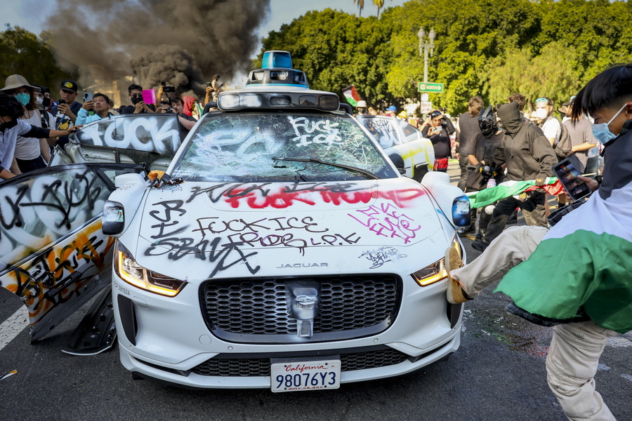 Η αστυνομία της αμερικανικής μεγαλούπολης χαρακτήρισε κάποιες συγκεντρώσεις «παράνομες», ισχυριζόμενη ότι οι διαδηλωτές πέταξαν κομμάτια τσιμέντου, μπουκάλια και άλλα αντικείμενα στην αστυνομία. Πολλά αυτοκινούμενα οχήματα της υπηρεσίας ταξί Waymo πυρπολήθηκαν σε κεντρικό δρόμο του Λος Άντζελες χθες το βράδυ, σύμφωνα με εικόνες από βίντεο.