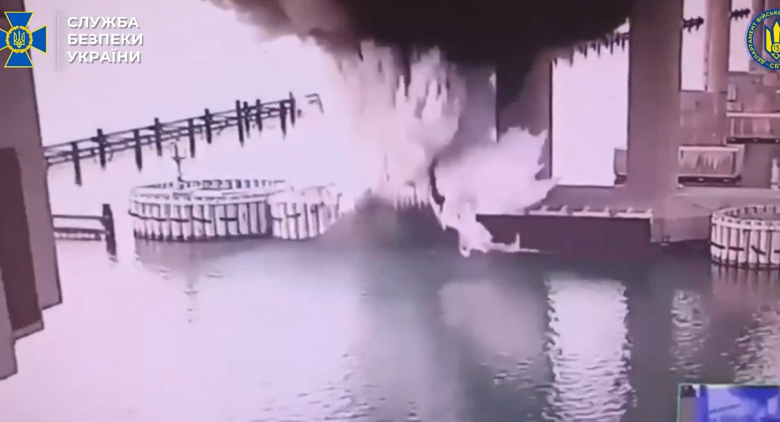 Η SBU κοινοποίησε βίντεο που δείχνει μια έκρηξη δίπλα σε έναν από τους πολλούς πυλώνες στήριξης της γέφυρας.
